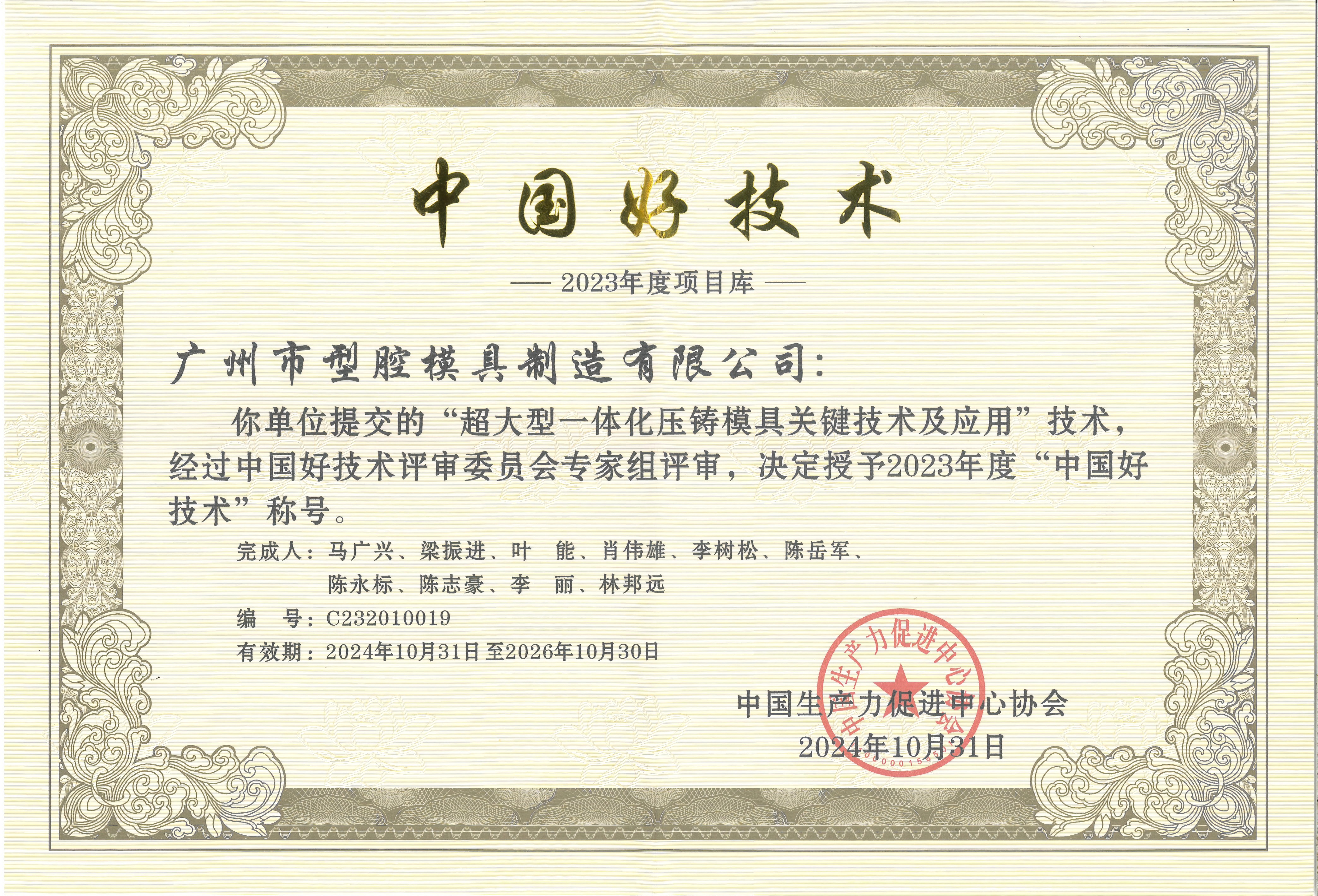 近日,由中國(guó)生產(chǎn)力促進(jìn)中心協(xié)會(huì)主辦的“中國(guó)好技術(shù)”大會(huì)暨2023年度“中國(guó)好技術(shù)”稱(chēng)號(hào)授予儀式在北京圓滿(mǎn)舉辦。中國(guó)生產(chǎn)力促進(jìn)中心協(xié)會(huì)理事長(zhǎng)申長(zhǎng)江宣讀了2023年度“中國(guó)好技術(shù)”稱(chēng)號(hào)授予決定。經(jīng)嚴(yán)格評(píng)審,廣型科技的“超大件一體化壓鑄模具關(guān)鍵技術(shù)及應(yīng)用”項(xiàng)目入選2023年度“中國(guó)好技術(shù)”項(xiàng)目庫(kù),并榮獲“中國(guó)好技術(shù)”稱(chēng)號(hào)。